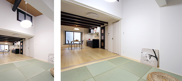 【和室】梁が印象的な吹き抜けのある和室は、LDK全体に光と風を通し快適にします。