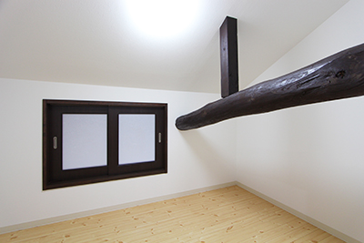 【寝室】間仕切りを無くし明るい空間に。1階とは違う無垢フローリングにし、空間に変化を。