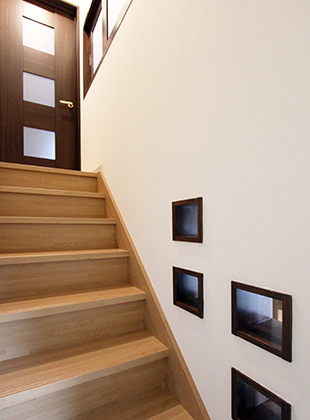 壁の飾り枠と2階の室内窓から光が入り、明るく安全な階段に。飾り枠には、集めてられていた小物を置けるようになりました。