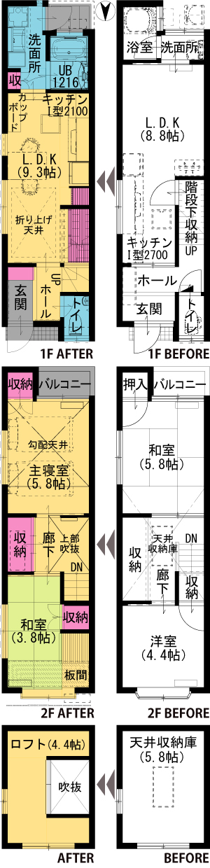 ■施工内容 /キッチン:LIXIL アミィⅠ型W2100(IHコンロ・食洗機)+カップボード/UB:TOTO サザナ1216サイズ/トイレ:TOTO ネオレストRH1/洗面化粧台:TOTO STシリーズ/床:無垢フローリング、クッションフロア―、集成材フロア―(ロフト)、タイル(玄関)、縁なし畳(和室)/壁・天井:クロス/収納、テレビカウンター、手すり壁(ロフト)造作/手すり、室内物干し取付け/階段架け替え/建具、サッシ新調/ウッドデッキ、バルコニー新設/床暖房/断熱工事/外壁塗装、サイディング貼り/屋根葺き替え/防蟻工事/