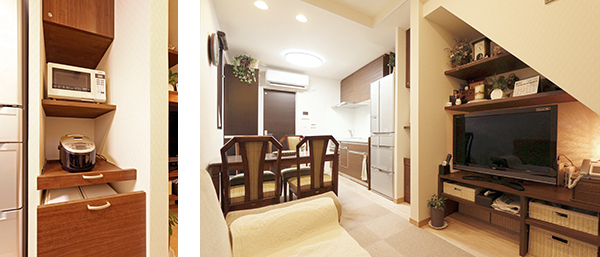 【リビング】ごみ箱がスッキリ入る家電収納(写真左)やテレビボード(写真右)を造作。リフォーム後お伺いした際、ご提案した通りに間接照明を飾って下さっていて、キレイにお使い頂いていることに感動しました。