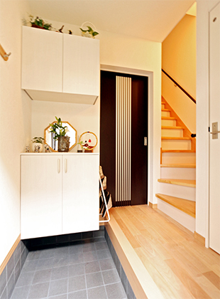 【玄関】玄関収納の下を浮かせて、広く感じられるように。