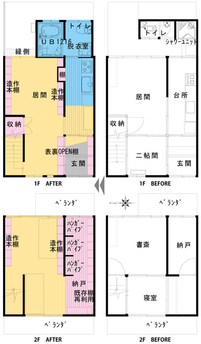 ①家の中でも寒い。 ②入りきらない本があるから本棚がたくさん欲しい ③町のみんなが集まれる家にしたい。 お客様の悩みは①②番でした。予算も考えた上で、暖かい無垢のパインフローリングや冷気を通さないインナーサッシ。壁に立ち並ぶ、造作の本棚やお持ちのカラーボックスの再利用を提案させていただきました。③番は1階の居間をコミュニティとし、大量の本が入る本棚にホワイトボードの伝言板など工夫を凝らしました。これからコミュニティとして、どうなるかとても楽しみですし、またお伺いしたいです!