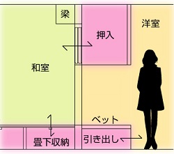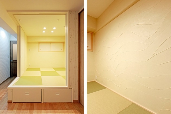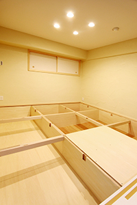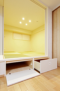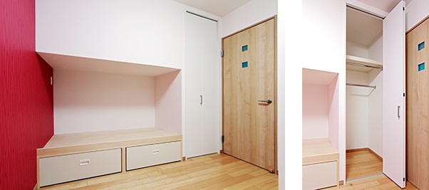 ベット下は引出しの収納スペースにし、上は和室から使える収納スペースとして空間を有効活用しました。