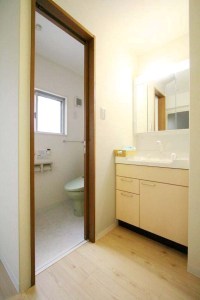 ■施工内容/キッチン・UB・洗面台:アップハウステック3点セット/キッチン:ハウステックエクセリアW2550/UB:フェリテ1616/洗面化粧台:ラヴァーボW750/トイレ:アメージュV/LDK・床:ジュピーノパインフローリングナチュラル/壁:珪藻土/対面カウンター造作/ダウンライト/2階洋室・床:ジュピーノパインフローリングハニーブラウン/壁:珪藻土/玄関収納コンポリア造作/ペアサッシ取付