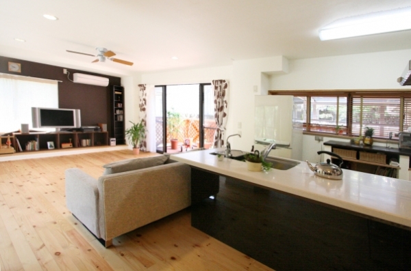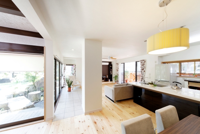 LDKの明るさ・風通しの問題になっていた間仕切壁を取り払うことで、RC造ならではの大空間が誕生。庭に面する床の一部には、タイル敷きにして観葉植物などが置けるように提案。