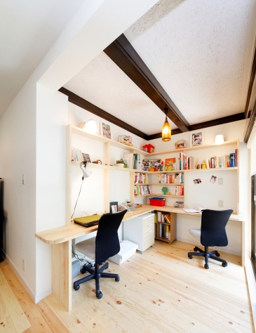 LDKの一隅にはパソコンや本など趣味のものを利用するカウンターを造作し、書斎コーナーとして活用。LDKにはないダークブラウン調の梁が他にはない雰囲気を演出。