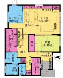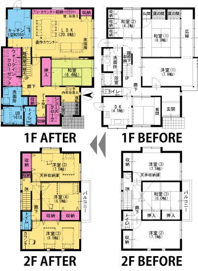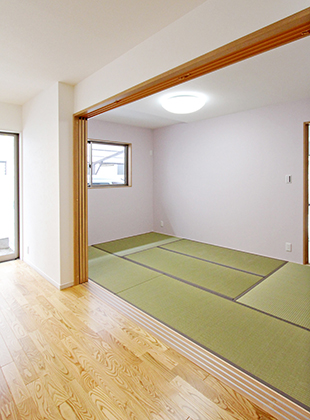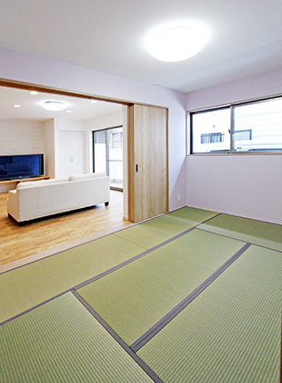 ■施工内容 /キッチン:クリナップ ラクエラⅠ型W2550(IHコンロ・食洗機)+カップボード/UB:TOTO サザナ 1618サイズ/洗面化粧台:TOTO サクアW750/トイレ:TOTO GG タンクレス(1F)、HVタイプ(2F)/床:無垢フローリング(床暖房対応)、クッションフロア(トイレ・洗面所)、フロアタイル(洋室・WIC・2F廊下)、畳(和室)、タイル(玄関)/壁:クロス、一部珪藻土(LDK・玄関)/天井:クロス/収納、棚、カウンター、ニッチ造作/階段架け替え/建具新調/サッシ新設/床暖房/外壁、外塀塗装/カーポート屋根貼り替え/
