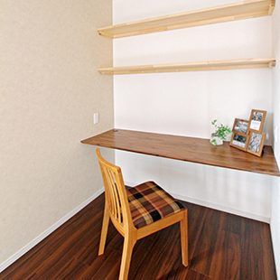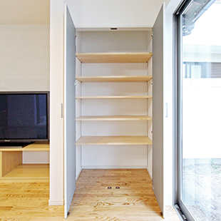 散らかりがちな書類やお子様の本、DVDなどを片付けられるよう収納を造作。