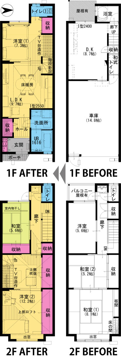 ■施工内容 /キッチン:クリナップ クリンレディⅠ型W2550(IHコンロ・食洗機)/UB:トクラス ビュートリベロ1616サイズ/洗面化粧台:TOTO サクアW750(1F)、W600(2F)/トイレ:TOTO ピュアレストQR(1F・2F)/床:集成材フローリング(LDK:床暖房対応)、無垢フローリング(2F洋室)、クッションフロア(トイレ・洗面所)、畳(和室)、タイル(玄関)/壁:クロス、珪藻土(LDK・トイレ)/天井:クロス/ロフト新設/収納、棚造作/室内物干し取り付け/建具新調/サッシ新設/床暖房/外壁サイディング貼り、塗装/屋根葺き替え/防蟻工事/