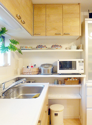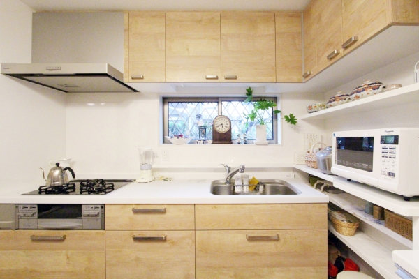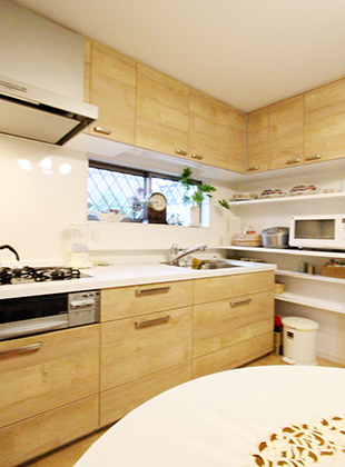 どこに何をしまうか、どんな家電を置くかを打ち合わせでしっかりと決めていただいたので、今では使いやすくなりました。また、木目調のキッチンは空間が明るくなるので、お気に入りです。