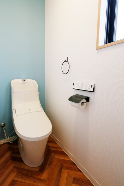 スカイブルーのクロスとヘリンボーンの床でおしゃれなトイレ