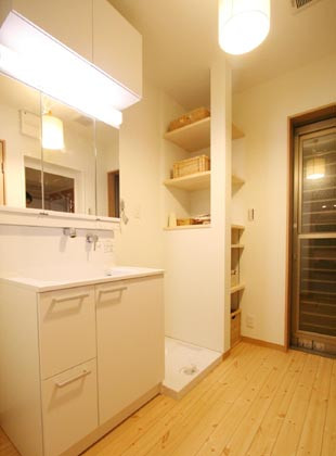 【洗面収納】2方向から出し入れ可能な洗面収納を造作。